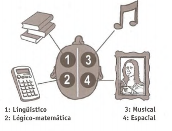 "Imagine um crânio visto de cima: no hemisfério esquerdo, temos os módulos cognitivos Lingüístico e o Lógico-matemático; no direito localizam-se o Musical e o Espacial:"